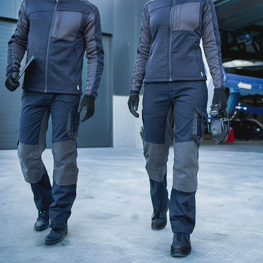 Moderne und flexible Arbeitshose mit einem Hauptstoff mit mechanischem Stretch und 4-Way-Stretch-Einsätzen an Knie, Kniekehle, Schritt und hinten unter dem Bund.